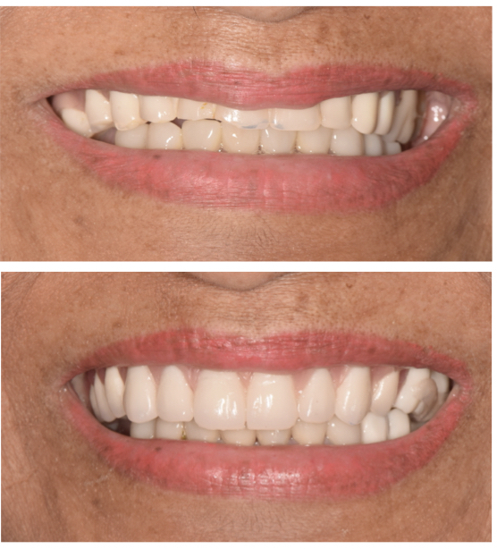 Paciente deseaba una sonrisa donde sus dientes se notaran más. Logramos esto aumentando la altura de sus muelas (dientes posteriores). Esto creó el espacio extra necesario en la parte delantera para poder colocar dientes frontales más grandes y visibles.