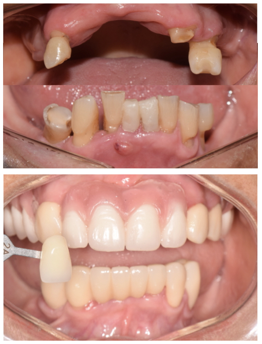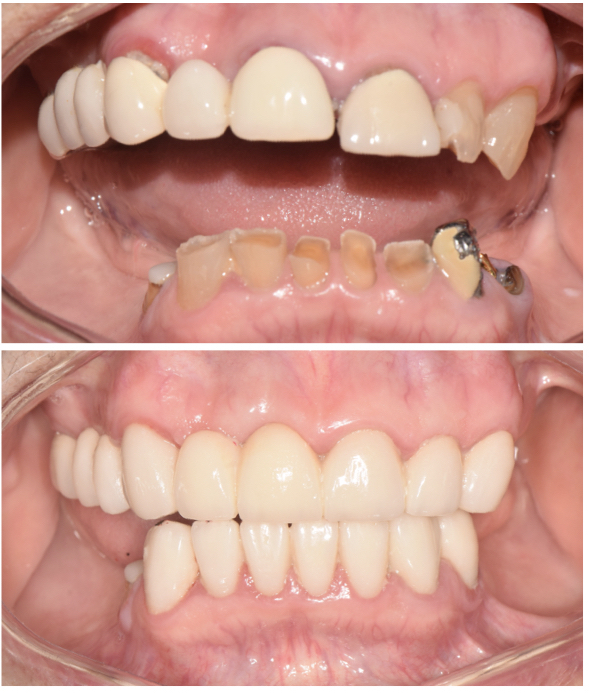 Tratamiento de rehabilitación oral combinando coronas fijas y puentes con prótesis removibles, mejorando la estética de los dientes con carillas cerámicas.